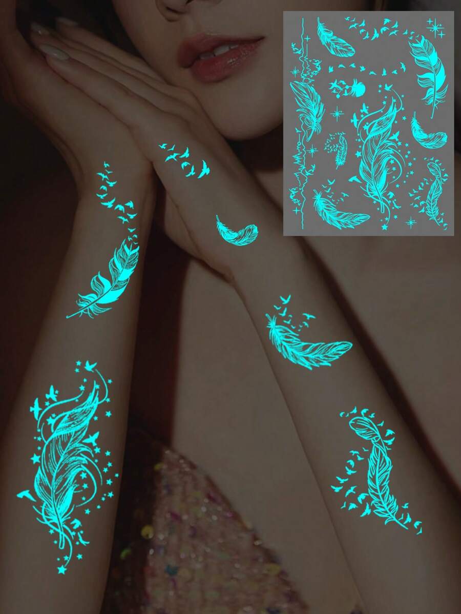 1 Arkusz Duży Rozmiar Niebieski Świecący I Biały Tusz Świecący W Ciemności Oryginalność Body Art Tymczasowe Naklejki Tatuażowe, Brokat Latający Ptak Gwiaździste Niebo Pióra Wzór, Wodoodporny Fałszywy Tatuaż, Trwałość 2-5 Dni, Zakrywający Blizny, Może Być Używany Na Ramionach Nadgarstkach Nogach Talii Szyi Dłoni Klatce Piersiowej Udach Palcach, Prezent Niespodzianka Na Imprezę Urodzinową