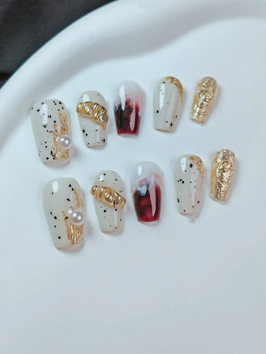 10 szt. luksusowych, ręcznie robionych, 3D, zdobionych złotą folią, krótkich, trapezowych, błyszczących, sztucznych paznokci, zestaw do zdobienia paznokci na święta i do codziennego użytku, zawiera pilnik do paznokci, obcinacz do paznokci, żelowe podkładki, dociskane paznokcie, artykuły do paznokci, paznokcie