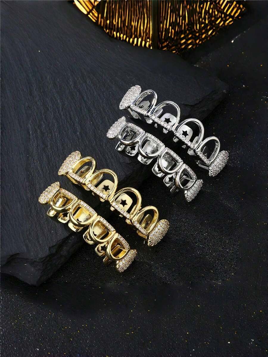 1 szt./2 szt. w stylu hip-hopowym, wydrążone zęby wampira, inkrustowane błyszczącą cyrkonią, platerowane 18-karatowym złotem, akcesoria na Halloween, świąteczne, uliczne, w zestawie pęseta i wosk dentystyczny, wydrążone aparaty ortodontyczne w stylu hip-hopowym, inkrustowane cyrkonią 5A, zęby zombie odgrywają rolę akcesoriów do aparatów ortodontycznych w stylu rap.