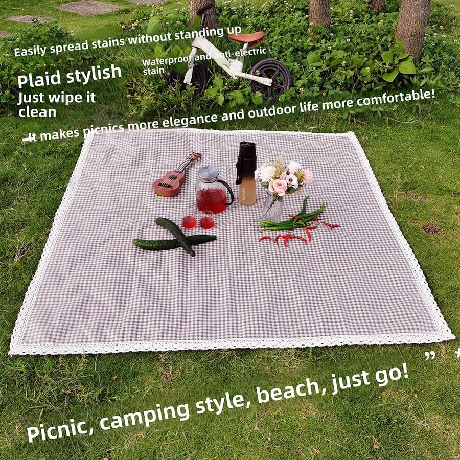1 szt. mata piknikowa w kratę z koronkową lamówką, powlekana poliuretanem, odporna na olej i wodę, koc plażowy, prosty i elegancki