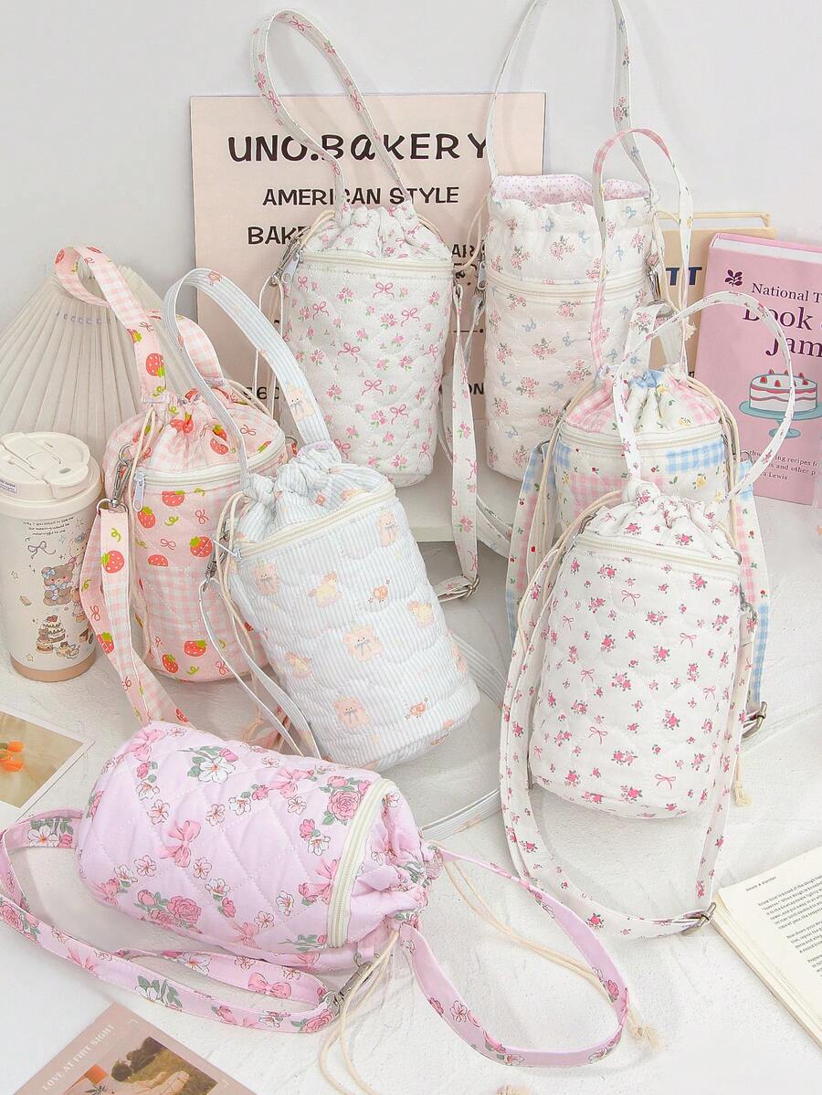 1 szt. pikowana okrągła torebka na ramię, torebka typu wiadro, śliczna okrągła torebka, przenośna torba podróżna na butelkę z wodą, torba na ramię z kieszenią na telefon, uchwyt na butelkę z wodą, torba podróżna na ramię z kwiatowym wzorem i kokardą, z odpinanym paskiem na ramię, śliczna okrągła torebka do podróży, codziennego życia, biura, nauki, na zewnątrz, do pracy, prezent urodzinowy, prezent dla przyjaciela