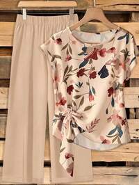 Franclia 2 szt./zestaw elegancki damski strój casualowy, bluzka z okrągłym dekoltem i krótkim rękawem oraz spodnie z elastyczną talią, elegancki damski T-shirt, letni damski T-shirt, strój letni, strój plażowy, T-shirt plażowy, T-shirt outdoorowy, damski strój wakacyjny, T-shirt wakacyjny, damski T-shirt casualowy, eleganckie spodnie damskie, letnie spodnie damskie, strój letni, strój plażowy, spodnie plażowe, spodnie outdoorowe, damski strój wakacyjny, spodnie wakacyjne, damskie spodnie casualowe, nowy letni damski zestaw 2 szt.