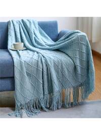 Pół jasnoniebieskiego, długiego koca z frędzlami w kształcie rombów, dostępny w wielu kolorach, miękki i wygodny, odpowiedni na każdą porę roku, wielofunkcyjny, odpowiedni do łóżek, sof, podróży, na kemping i do wnętrz samochodów - koc z frędzlami w stylu nordyckim, wykonany z całorocznego włókna poliestrowego, wygodny i oddychający, wzór w romby - idealny wybór dla entuzjastów podróży - przenośne opakowanie. 130*170CMLokalny