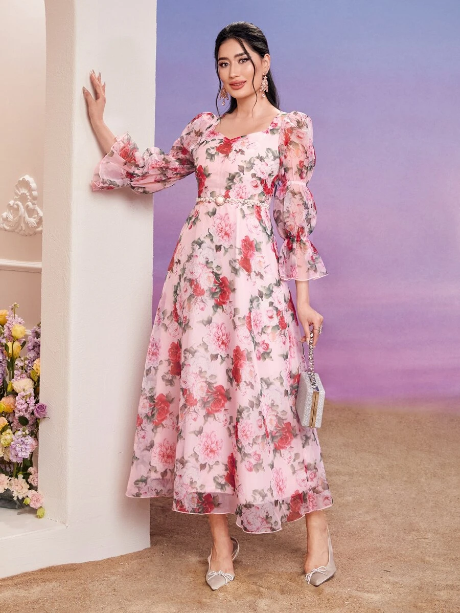 Modelyn Sukienka z organzy z nadrukiem kwiatowym, dekoltem w serduszko, falbaniastymi rękawami i bez paska, długie suknie wieczorowe