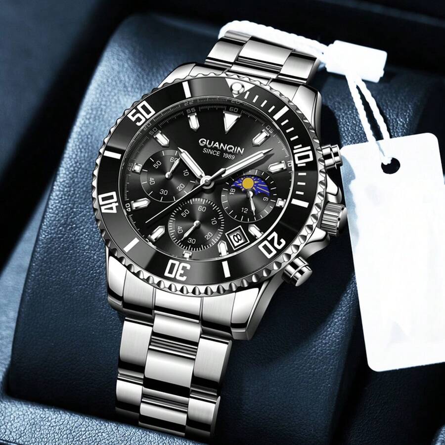 1 szt. GUANQIN Wodoodporny, świecący zegarek chronograf z kalendarzem i fazami księżyca, odporny na zużycie pasek ze stali nierdzewnej, modny, biznesowy, luksusowy, sportowy, klasyczny, prosty, codzienny, mechaniczny, męski, automatyczny zegarek kwarcowy, odpowiedni na Walentynki, festiwale, randki, biznes, na co dzień, prezenty