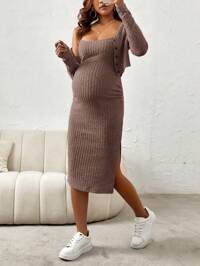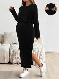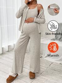SHEIN 2-częściowy zestaw ciążowy, swobodny, prążkowany top z długim rękawem i spodnie, ubrania jesienne, ubrania jesienne z długim rękawem, zestaw dwuczęściowy ciążowy, dzianinowy zestaw dwuczęściowy, wygodny zestaw dwuczęściowy dla kobiet, ubrania ciążowe, dwuczęściowe garnitury, wygodny zestaw dwuczęściowy