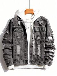 Manfinity Homme Męska kurtka dżinsowa z długim rękawem, podarta, postrzępiona, z kieszeniami z klapką, bez koszulki, prosta, jasnoróżowa, imprezowa, punkrockowa kurtka dżinsowa na prezent dla chłopaka, wyjście, spędzanie czasu w mieście, dojazdy do pracy, wakacje, jesień#5 Bestsellery