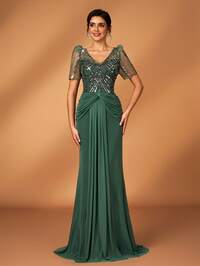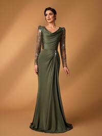 SerinSerin Elegancka, luksusowa, zdobiona koralikami, cekinami, bufiastymi kwiatami, elastyczna, marszczona, falbaniasta, z guzikami w kształcie diamentu, syrenka z przezroczystymi rękawami, idealna na wesele, imprezę, święta, ślub, wieczorową suknię dla matki panny młodej
