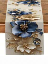 1 szt. Elegancki obrus ze złotą lamówką i niebieskim wzorem kwiatowym – prostokątny, do wnętrz i na zewnątrz, do kuchni, jadalni, na spotkania świąteczne, dekoracje stołu, nakrycie stołu kuchennego, wyrafinowany styl, wysokiej jakości tkanina, dekoratorzy wnętrz, elegancki bieżnik na stół jadalny, bieżnik na stół jadalny, koronkowy bieżnik i zestaw obrusów, bieżnik (33,5 x 89,7 cm/122,7 cm/153,7 cm)