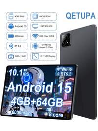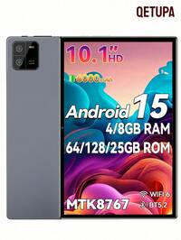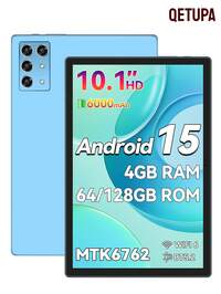 Qetupa Tablet z systemem Android 15, 10,1-calowy procesor ośmiordzeniowy MTK 8767 1,6 GHz, 4 GB/8 GB pamięci RAM + 64 GB/128 GB/256 GB pamięci ROM, 802.11ax WiFi 6, Bluetooth 5.2, ekran dotykowy Incell HD (1280*800) IPS, dwa aparaty 5 MP + 13 MP, bateria 6000 mAh, port typu C, odpowiedni na Boże Narodzenie, Halloween, Święto Dziękczynienia, rocznicę i prezenty wielkanocne (adapter nie jest dołączony)