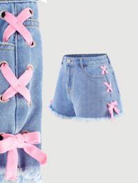 GirlismSHEIN Girlism Szorty jeansowe dla nastolatek Y2K, wiosna-lato, niski stan, kokardka, jasnoniebieskie, sprane, luźne, z surowym brzegiem, stylowe, codzienne, boho, na koncert, festiwal, impreza, impreza