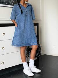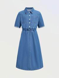 Elladie kidsSHEIN Moda dla nastolatek, casualowa, vintage, fajna, uliczna, powrót do szkoły, college, wygodna i dopasowana, niebieska, dżinsowa, koszulowa, jednoczęściowa, mini spódniczka, ubrania dla nastolatek, codzienne ubrania i zimowe, jesienne stroje rave, festiwale i stroje, ubrania uliczne, niebieska, dżinsowa sukienka, dziecięca, dżinsowa sukienka, dziewczęca SHEIN Sukienka koszulowa z krótkim rękawem w kolorze niebieskim, workowatym i luźnym, z miękkiego i uroczego jeansu dla nastolatek, letnie stroje na brunch i ukończenie szkoły, wakacyjne stroje dla nastolatek/na plażę w stylu boho, strój na koncert country/rave, odpowiednie na co dzień, w podróż, na zewnątrz, do domu, na brunch, przyjęcie herbaciane, dojazdy do pracy, na lotnisko, jesienne stroje dla nastolatek, ubrania na powrót do szkoły w stylu preppy