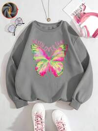 Różowe i zielone wzory motyli i liter łączą się ze sobą. Ten sam styl dla chłopców i dziewcząt, bluza z opadającymi ramionami, oversize, okrągły dekolt, luźna, swobodna, uniwersalna, w stylu ulicznym, w stylu preppy, ubranka dla dzieci z bawełnianą podszewką, wygodna bluzka z długim rękawem.