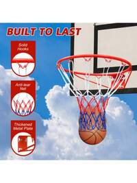 Obręcz do koszykówki 45,72 cm, zamienna, mocowana do drzwi, wytrzymała obręcz do koszykówki z elastyczną obręczą i siatką, pasuje do koszy do koszykówki wpuszczanych w ziemię i montowanych na ścianie, do użytku wewnątrz/na zewnątrz (czerwona)