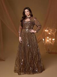 Aureia Elegancka, luksusowa, haftowana koralikami, patchworkowa sukienka w kolorze kawy, z elastycznego satynowego materiału z odkrytymi ramionami, dopasowana, plisowana, w dużym rozmiarze, z nakładką, odpowiednia na wieczorne przyjęcia, gale, wesela, miesiąc miodowy i inne wydarzenia sezonu ślubnego (skomplikowany wzór)