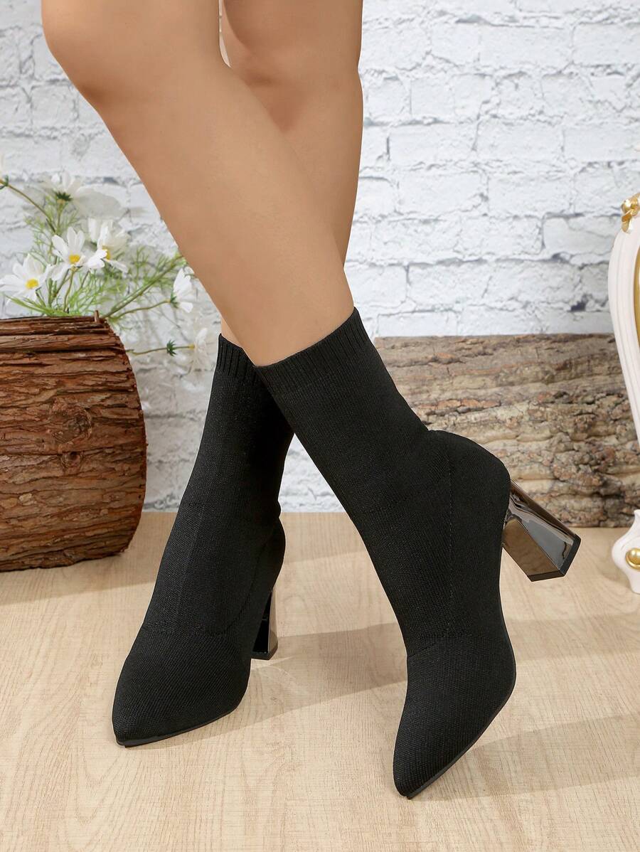 Damskie dzianinowe botki do połowy łydki na wysokim obcasie z szpiczastym noskiem, klasyczne damskie krótkie botki, nowe jesienno-zimowe botki na wysokim obcasie i grubym obcasie, buty na co dzień z gumką do biura, domu, na zewnątrz, na imprezę