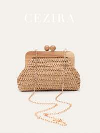 Damska kopertówka z drewnianą ramą, zapięciem magnetycznym, słomianym, plecionym woreczkiem, długim łańcuszkiem, na ramię, do ręki, torebka na wakacje, na plażę, lekka i przenośna, na wakacje, podróże, nad morze, na co dzień, na wiosnę i lato