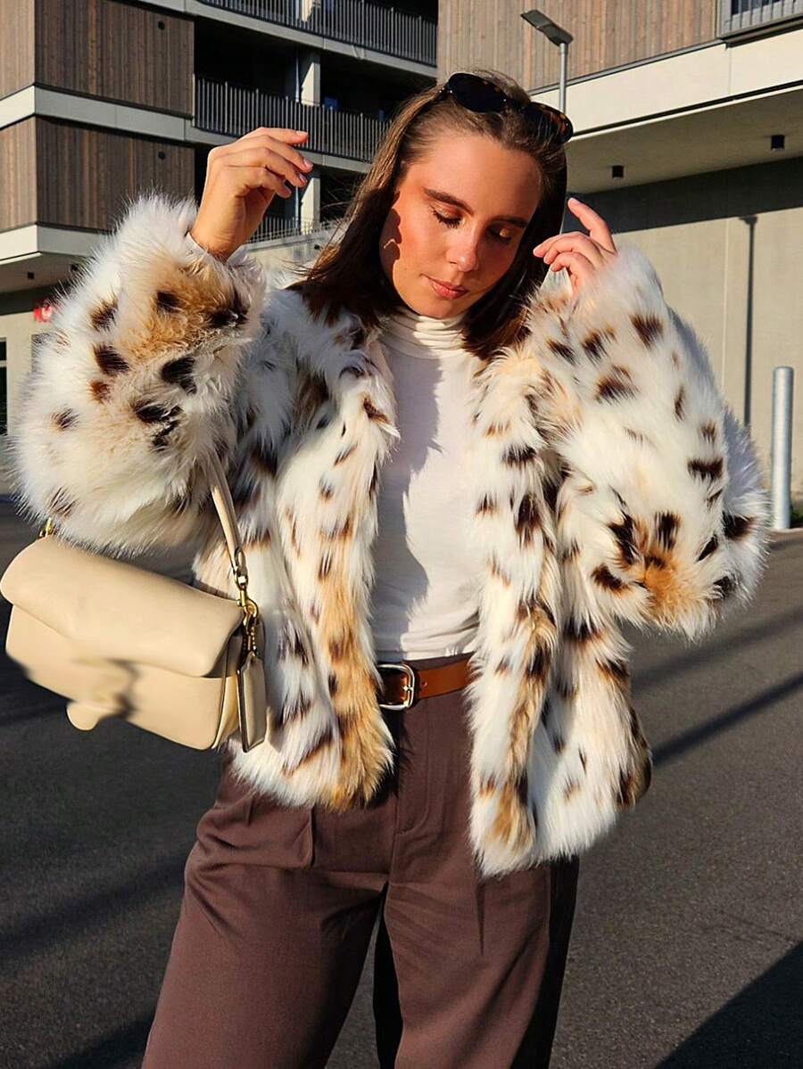 Jesienno-zimowy damski płaszcz z dużym kołnierzem, łatami i nadrukiem w panterkę, ze sztucznego futra, chroniący przed zimnem.