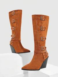 MOTFDamskie, jesienno-zimowe, modne, wciągane kozaki za kolano z ozdobnym zapięciem, stylowe, eleganckie, seksowne, szpiczaste noski, wąskie, wysokie kozaki na obcasie, kozaki retro z nogawkami, kozaki za kolano, kozaki z szeroką nogawką, kozaki w stylu francuskim