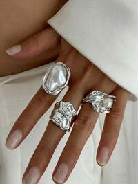 Zestaw 3 pierścionków z metalu w stylu vintage, asymetryczny, złoty, abstrakcyjny, z motywem pereł, zestaw biżuterii z perełkami w stylu barokowym, gruby, nadający się do układania w stosy, odpowiedni do codziennej dekoracji kobiet, na różne przyjęcia, dopasowujący się do mody, na prezenty świąteczne #1 Bestsellery