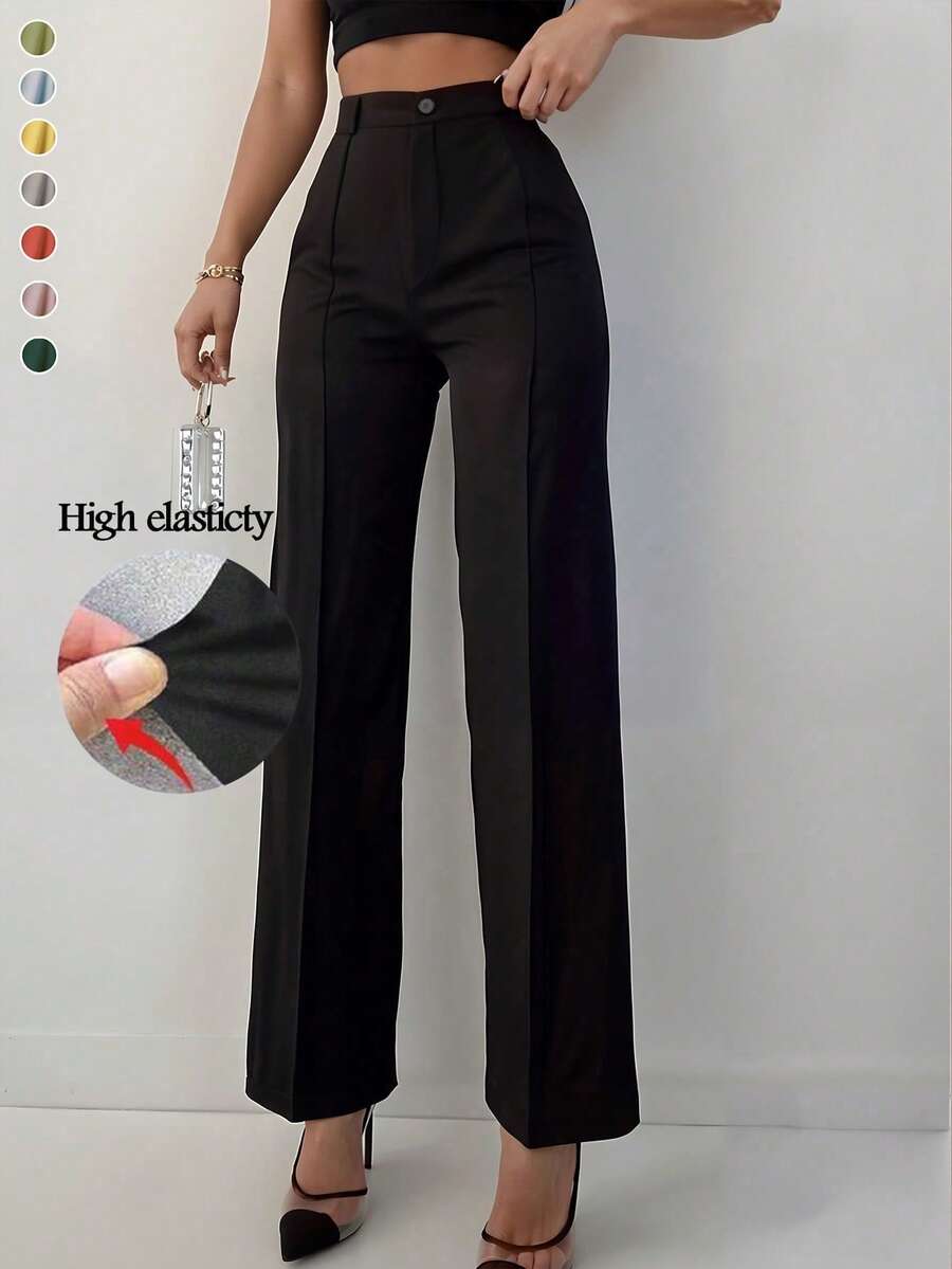 Damskie spodnie na jesień/zimę, cienka, elastyczna dzianina, jednokolorowe, z wysokim stanem i guzikami z przodu, proste i uniwersalne, wyszczuplające, proste nogawki, odpowiednie na co dzień i do pracy