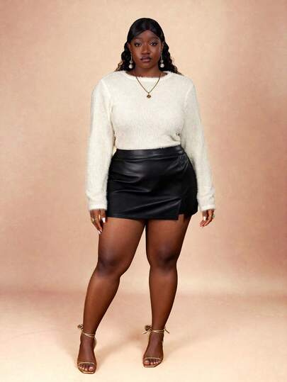 Enliva Spódnica damska plus size w jednolitym kolorze, czarna, prosta, swobodna, krótka, dopasowana do okrągłych kształtów, zimowa, dla sylwetki o kształcie jabłka