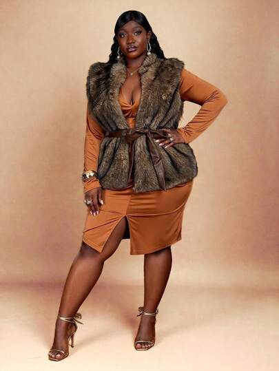 Enliva Kurtka z kapturem i luźnym futerkiem PU w dużym rozmiarze, kontrastowy patchwork ze sztucznego futra, detale kieszeni, odzież wierzchnia na zimę, jesień/zimę