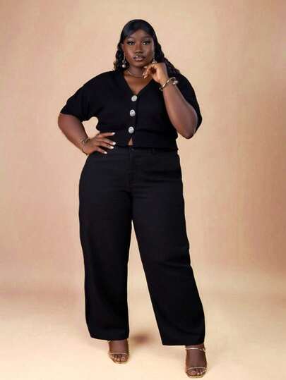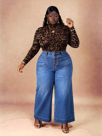 CurvyTilda Damskie jeansy Plus Size, luźne, z szerokimi nogawkami i kieszeniami na guziki