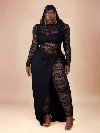 CurvyTilda Plus Size Women Długi Rękaw Siatka Patchwork Stójka Minimalistyczna Elegancka Długa Sukienka